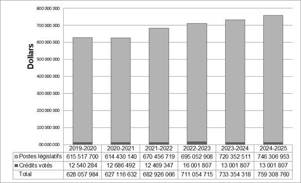 Le tableau ci-dessous présente, pour le soutien aux juges de nomination fédérale, les dépenses budgétaires pour l’exercice 2022‑2023 ainsi que les dépenses prévues pour cet exercice et les deux exercices suivants.